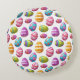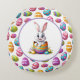 This round throw pillow is shown with a cute festive Easter bunny eggs print.