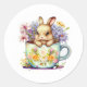This round sticker is shown in white with a cute Easter bunny in a tea cup watercolor print.