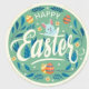 A circular design featuring the text "Happy Easter" in a playful, cursive font. The background is a soft green with decorative elements including colourful Easter eggs and a cute blue bunny peeking out. Surrounding the text are floral and leafy designs in various shades of green adding a festive touch.