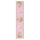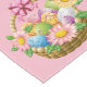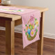 This table runner is shown with a pretty pink background colour and has a cute festive Easter basket,eggs and chicks print.