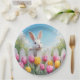 A curious white rabbit pokes its head over a white picket fence, surrounded by vibrant tulips in shades of pink and yellow.