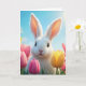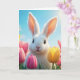 A fluffy white rabbit with large ears is surrounded by colourful tulips, basking under a bright, sunny sky.