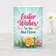 This card features a spring-themed digital illustration that pairs a romantic message with garden details 🌷. Across the upper half, the words “Easter Wishes” sit large in fuchsia lettering, curving gently as if floating in the air. Just below, “for the One I Love” appears in softer green text, nestled between small golden flourishes that feel like a delicate frame. In the lower section, a fully opened golden-yellow rose takes center stage, its layered petals drawn to look plush and velvety, like something you’d lean in close to admire. Around it are lush green leaves, tiny white and pink blossoms, and slim yellow buds that read like early spring growth. Three glossy egg-shaped decorations sit nearby, one with orange and teal stripes, one in calm teal with faint floral markings, and one with pink and red bands 🐇. Behind everything, a sky-blue gradient fades outward while soft white rays spread from the top, and the gold accents catch the light with a gentle sheen.
