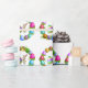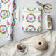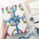 This Easter wrapping paper is shown with a cute festive Easter eggs wreath and bunny print on a white background.