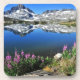 Pink flowers on rocky cliff by blue lake