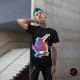 Sleek, stylish and bold skateboarder abstract design. The design features a colourful and abstract image of a skateboarder. The image is made up of bright colours and bold lines with a modern and edgy vibe, reflecting the personality and style of the skateboarder. This design is perfect for anyone who loves to skate and express themselves through art. "EASY DOES IT DO IT EASY" in a purple sprite graffiti and yellow city lights font.