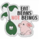 "Eat Beans Not Beings" sticker features a bean and a pig with a vegan quote.