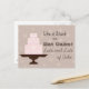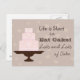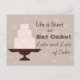 "Life is short so eat cake, lots and lots of cake" - Cute tiered cake on cake stand. Brown and pink pattern on postcard.