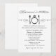 Black and white wedding rehearsal and rehearsal dinner invitation design with an eat, drink, and be married theme in elegant and vintage mixed typography with diamond engagement ring place setting scroll feature.