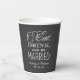Wedding paper party cups feature an elegant "Eat, Drink, and Be Married" mixed typography quote design in white with a charcoal grey / soft black background colour - note, colours can be customised. Personalise with the bride and groom names and their wedding date.