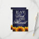 Eat Drink and Be Married Rustic Wedding RSVP Cards-match the invitations and more found below on this page. Compliment your sunflower wedding theme with these rsvp cards that feature a blue chalkboard as a background with "Eat, Drink & Be Married" in fun & elegant script with vibrant sunflowers at the bottom of the front and back of each card.These wedding RSVP cards are set to high quality basic card stock; however, you can change the stock to linen, felt (embossed), recycled, and several metallic shades if you would like under number 2 (choose your style, size & paper type) below the orange add to cart button. A list of the additional costs for a fancier card stock are displayed also under that option. Each RSVP card comes with a fitted white envelope.