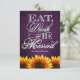 Eat Drink and Be Married Rustic Wedding RSVP Cards-match the invitations and more found below on this page. Compliment your sunflower wedding theme with these rsvp cards that feature a purple chalkboard as a background with "Eat, Drink & Be Married" in fun & elegant script with vibrant sunflowers at the bottom of the front and back of each card.These wedding RSVP cards are set to high quality basic card stock; however, you can change the stock to linen, felt (embossed), recycled, and several metallic shades if you would like under number 2 (choose your style, size & paper type) below the orange add to cart button. A list of the additional costs for a fancier card stock are displayed also under that option. Each RSVP card comes with a fitted white envelope.