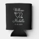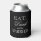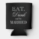 Eat drink and be married wedding can coolers. Custom wedding can coolers. Personalised wedding beverage holder for guests. Also available as bottle holders with names of bride and groom plus cute heart and arrow. Romantic love symbol design and classy script typography. Make one for bride and bridesmaids. Create your own cosy wedding favour / souvenir for guests at your party. Romantic theme beverage holder design. Perfect for alcoholic drinks like beer. Also available for bottles. Elegant script letters. Custom background colour. Vintage print for chic wedding, fancy bridal party, fun bachelorette party etc.