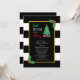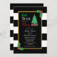 Eat, drink and be merry Christmas baby shower invitation featuring a Christmas tree and gifts against a gold frame. Black and white striped background with holly
