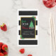 Eat, drink and be merry holiday party featuring a Christmas tree and gifts against a gold frame. Black and white striped background with holly