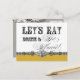 Elegant and fun fonts announce the message, "Let's eat, drink and get married!" on a delightful whimsical save the date announcement postcard. In a clean, crisp, mustard gold, grey, and white colour palette it's the best of vintage with a modern twist.