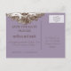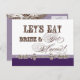 Elegant and fun fonts announce the message, "Let's eat, drink and get married!" on a delightful whimsical save the date announcement postcard. In a clean, crisp, lavender, plum purple, chocolate brown and white colour palette it's the best of vintage with a modern twist.