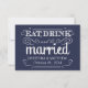 RSVP Chalkboard Wedding - Rustic Eat, Drink, and be Married Response cards -- Elegant vintage swirls with retro chalk typography on trendy modern round corner cards. Navy blue and white chalk board style reply cards are perfect for modern weddings with a sweet rustic touch of romance for the sophisticated and traditional bride and groom. Easy to use template can be modified for semi-formal weddings. Matching invitations, postage, save-the-date, thank you, photo cards and favours available upon request. Click Customise It to change the type style, colours, and size of fonts. Please contact us for help with customisation if you need additional room for your wedding details.