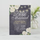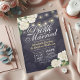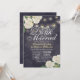 EAT Drink and Be Married Wedding Celebration / Bridal Shower Invitation Cards Templates - Elegant White Hydrangea Flowers and String Lights on Vintage Navy Blue Floral Linen Background.