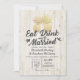 Vintage Wedding / EAT Drink and Be Married invitation Template - Elegant Faux Gold Foil Pineapple Couple on Rustic White Wood Background.
