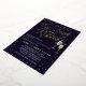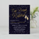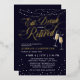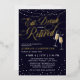 Elegant Eat, Drink and Be Retired retirement party invitation with string lights, stars and flares, and champagne flutes against a deep dark blue background with gold foil details. Invite your friends, family members, and coworkers to a night of celebrating your retirement with these glamourous retirement invitations in darkest blue with champagne flutes clinking together and magical string lights! Eat, drink and be retired in gold foil with string lights, stars, flares and champagne bubbles in gold foil as well.