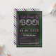 Halloween party invitation designed as a chalkboard with white, purple, and green text, spider webs, and a back featuring diagonal stripes in matching colours.