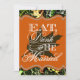 Eat Drink & Be Married Hunting Camo Wedding Invitations---match the RSVP cards and more found below on this page. Compliment your hunting camo wedding theme with these invitations that feature a leaves, bark and twigs as a background with Eat, Drink & Be Married in elegant script over a burnt orange text box. The text box also features a dark brown silhouette of an oak leaf for added decor. These wedding invitations are set to high quality basic card stock; however, you can change the stock to linen, felt (embossed), recycled, and several metallic shades if you would like under number 2 (choose your style, size & paper type) below the orange add to cart button. A list of the additional costs for a fancier card stock are displayed also under that option. Each invitation comes with a fitted white envelope. See matching wedding RSVP cards below to complete the suite.