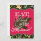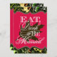 Eat Drink & Be Married Hunting Camo Wedding Invitations---match the RSVP cards and more found below on this page. Compliment your hunting camo wedding theme with these invitations that feature a leaves, bark and twigs as a background with Eat, Drink & Be Married in elegant script over a hot pink text box. The text box also features a brown silhouette of an oak leaf for added decor. These wedding invitations are set to high quality basic card stock; however, you can change the stock to linen, felt (embossed), recycled, and several metallic shades if you would like under number 2 (choose your style, size & paper type) below the orange add to cart button. A list of the additional costs for a fancier card stock are displayed also under that option. Each invitation comes with a fitted white envelope. See matching wedding RSVP cards below to complete the suite.