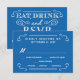 Eat, Drink, and be Married -- Vintage style rustic country wedding invitation personalised RSVP Response Cards -- Swirly, curly scrolls and old-fashion woodcut typography in radiant white on Pacific Ocean ultramarine blue background. Add the bride and groom names and wedding and reply dates in this easy to use template. Elegant but fun and whimsical, retro hand-written style can be can be easily modified for your formal or semi-formal wedding themes. Casual modern country style is perfect for trendy rustic weddings with a fun touch of sophisticated charm for traditional couples. Please contact us for help with customisation if you need additional room for your wedding details. Other sizes and styles available, along with matching invitations, postage stamps, coordinating accessories and shower favours.