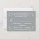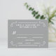 Eat, Drink, and be Married -- Vintage style rustic country wedding invitation personalised RSVP Response Cards -- Swirly, curly scrolls and old-fashion woodcut typography in radiant white on dove grey background. Add the bride and groom names and wedding and reply dates in this easy to use template. Elegant but fun and whimsical, retro hand-written style can be can be easily modified for your formal or semi-formal wedding themes. Casual modern country style is perfect for trendy rustic weddings with a fun touch of sophisticated charm for traditional couples. Please contact us for help with customisation if you need additional room for your wedding details. Other sizes and styles available, along with matching invitations, postage stamps, coordinating accessories and shower favours.