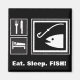 Striking black, white and grey coloured sign board style graphics depicting the necessities of life. Small eat and sleep icons using the standard food service knife and fork, and motel lodging roof and bed pictures. Extra large FISHING graphic showing a fish head and fishing hook, because of course fishing matters more than eating and sleeping!