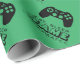 Eat Sleep Game Repeat funny Christmas & Birthday Wrapping Paper. Personalised gift wrap printed with your text. Available in matte and high glossy finish. Cool wrapping paper rolls for kids and adult who love gaming. Customisable green background colour. Fun for friends, family, coworkers etc. Console controller design.