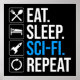 Eat. Sleep. Sci-Fi. Repeat. Funny sci-fi lover gift idea for a man, woman, teens or kids who love science fiction, outer space, rocket ships and exploring the universe, and is a scifi geek or nerd. Do you love science fiction books, sci-fi tv shows or sci-fi movies? If you’re a sci-fi fan, and have a sense of humour, then this design is perfect for you! Great to wear to a science fiction convention.