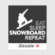 Eat sleep snowboard repeat. White and grey bold type on a solid black background. White silhouette snowboarder.