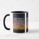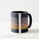 This two-tone mug features a brusher font with white letters gold outline displaying the "Ecclesiastes 4:10 KJV" bible scripture verse over a background picture showcasing dark silhouette images of people standing at the rails of a ocean pier under an abstract coloured sky with a multi coloured style. This verse is referencing the Book Of Ecclesiastes 4th chapter showing the 10th verse in this bible scripture quote theme from the King James bible. The rim & handle are glazed in matching colours available in 11-ounce or 15-ounce sizes microwave and dishwasher safe ceramic construction.