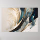 Fluid lines and sharp forms intertwine in an elegant motion between ivory tones and deep blue. An abstract dance that conveys expansion, energy, and harmony, as if space unfolded in waves of light and mystery.