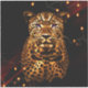 Eclipse Majesty, showcase a leopard with glowing golden fur and distinctive spots, set against a dark background. The leopard's eyes are illuminated in bright purple, creating a striking and mystical effect. The dark surroundings are accented by scattered, warm lights, giving the scene a dramatic almost otherworldly atmosphere.