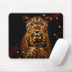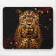 Eclipse Majesty, showcase a leopard with glowing golden fur and distinctive spots, set against a dark background. The leopard's eyes are illuminated in bright purple, creating a striking and mystical effect. The dark surroundings are accented by scattered, warm lights, giving the scene a dramatic almost otherworldly atmosphere.