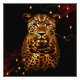 Eclipse Majesty, showcase a leopard with glowing golden fur and distinctive spots, set against a dark background. The leopard's eyes are illuminated in bright purple, creating a striking and mystical effect. The dark surroundings are accented by scattered, warm lights, giving the scene a dramatic almost otherworldly atmosphere.