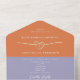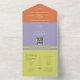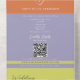 The main invitation includes elegant typography, a minimalist rope heart motif, and space for a QR code linking to your wedding website or RSVP page. The detachable section works as a printed wedding program, timeline, or ceremony guide that guests can keep. Bold color blocking in lavender, orange, and lime green adds a vibrant, fashion-forward touch.