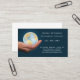 Professional business card featuring a hand offering an illuminated globe on a dark blue background.