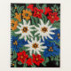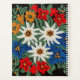 An image of a floral pattern with a needlework look of Edelweiss white Alpine flowers of Europe on your product. Blue, red, yellow, and white colours. Leontopodium alpinum of Switzerland, Germany, and Austria.