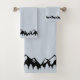 Edge of the forest landscape with trees and mountains in the background, on a smoky blue grey background. For lake house, mountain cabin, or cottage.