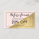Coordinates with the Edgy Geometric Faux Gold Foil and Pink Colour Block Business Card Template by 1201AM. This customisable referral card design features a faux gold foil dipped corner creating an intriguing shape juxtaposed with the soft pink. Referral cards are great for letting your customers spread the word about your services in exchange for discounts or promotions. Update the promotion text for your own unique offering. Art and design © 1201AM CREATIVE | www.1201am.com