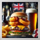 Experience the glory of British pub grub with this Edinburgh Eats Burger. A juicy Angus beef patty, grilled to perfection, is layered with aged cheddar cheese, crispy onion rings, and a dollop of H sauce, all nestled inside a toasted English muffin bun. A miniature British flag adds a touch of Scottish flair, while a backdrop of a pint of ale completes this authentic British pub creation.