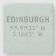 Edinburgh, Scotland longitude and latitude coordinates in distressed fonts give this a modern urban look