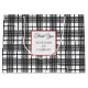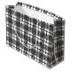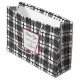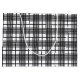 An editable gift bag with script and decorative letters on a square framed in red on a black and white glen-inspired horizontal plaid pattern with thin stripes.