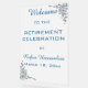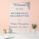 This editable acrylic sign features messages and information about an event over a frosted glass look and with blue flowers in two corners. The text is editable so go ahead and change the details as well as the font colour, size and style. This sign can be used for any event: retirement, anniversary, birthday etc.