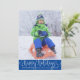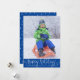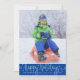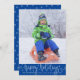 The greeting HAPPY HOLIDAYS is in a white handwritten script backdropped by an editable bright blue border. (PHOTO TIP: For fastest/best results, choose a photo with the subject in the middle and/or pre-crop it to a similar shape as shown BEFORE uploading and it will fill in the photo space provided perfectly.) COLOR CHANGE: