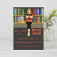 This editable invitation features an illustration of a woman sitting on a ledge reading a book and a bookshelf behind her. The details below are editable so go ahead and change the information as well as the font style, size and colour. There is an editable field for more information on the back, as well. The background colours on both sides can be changed, too.